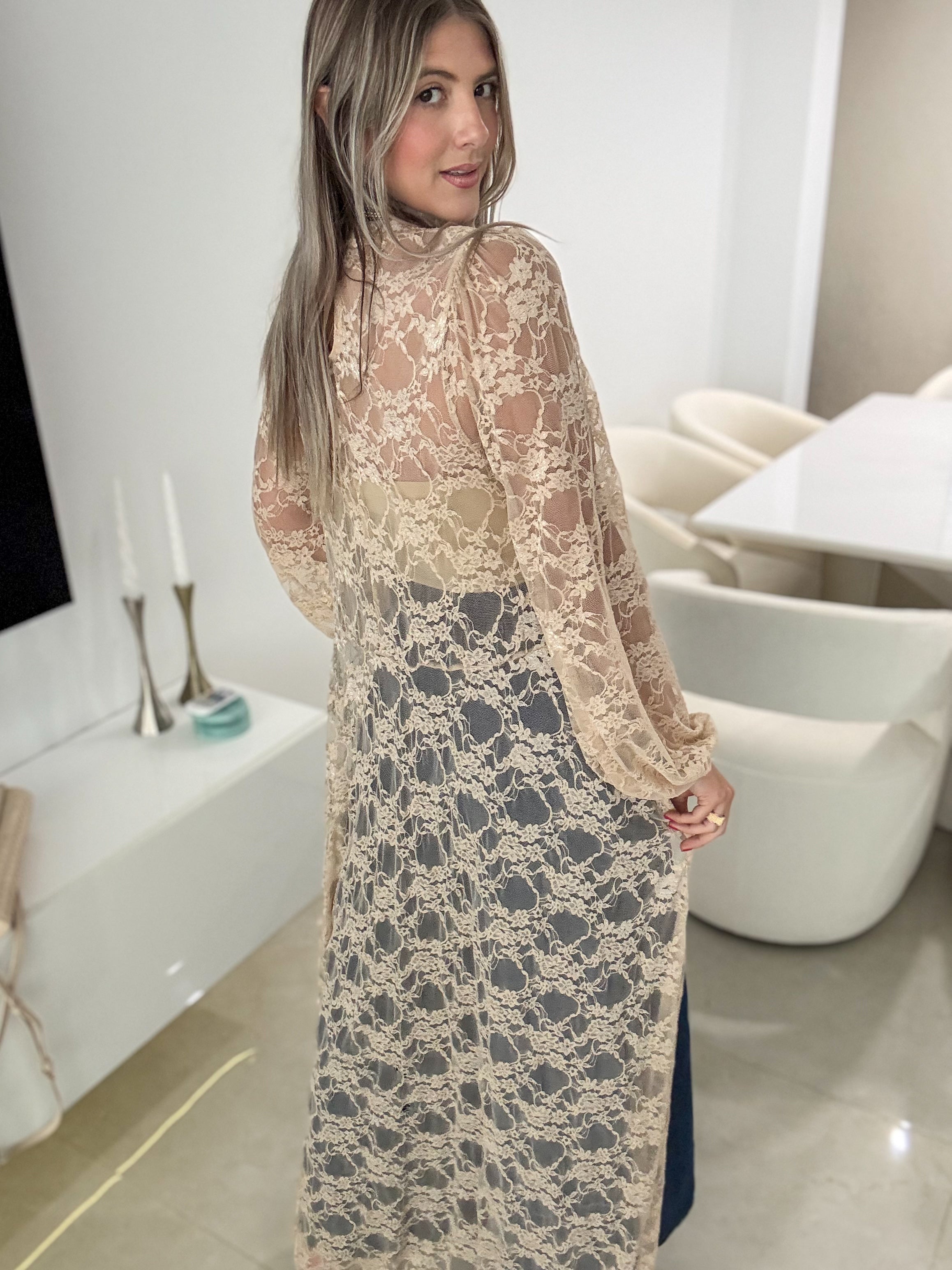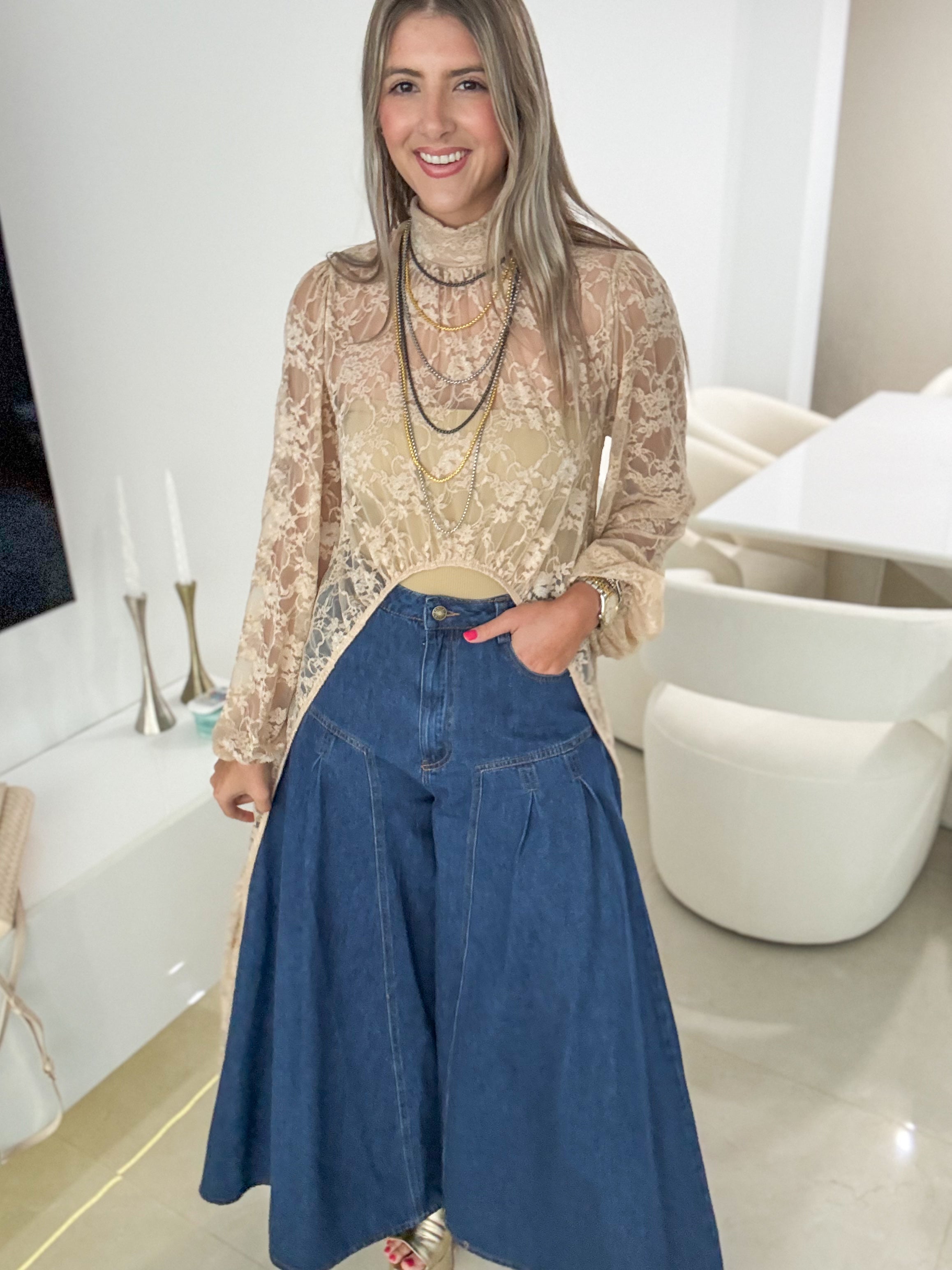BEIGE STRETCHY LACE HIGH LOW TOP