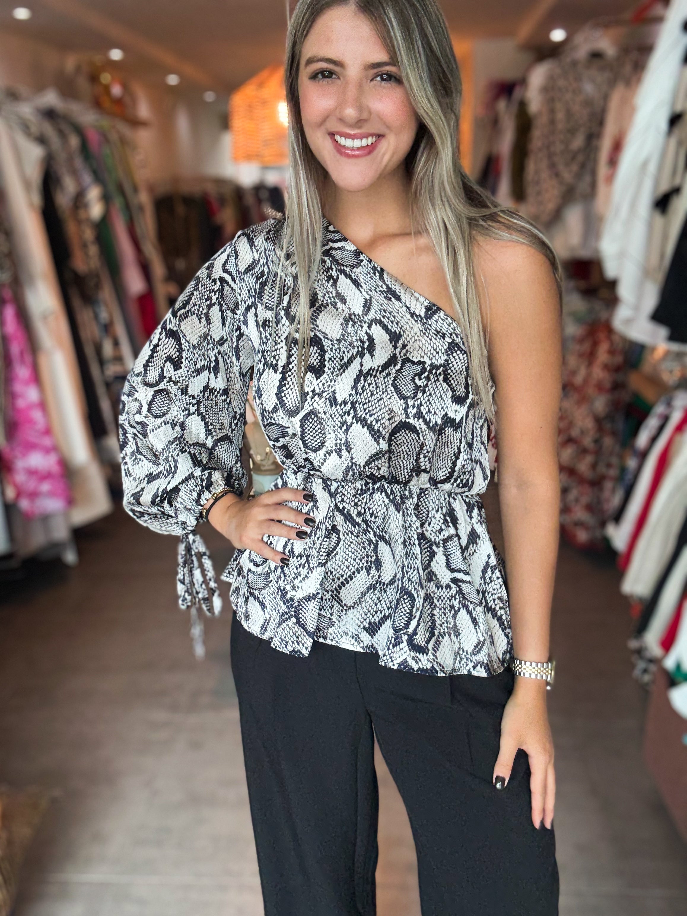 ONE SHOULDER SNAKE PRINT BLOUSE
