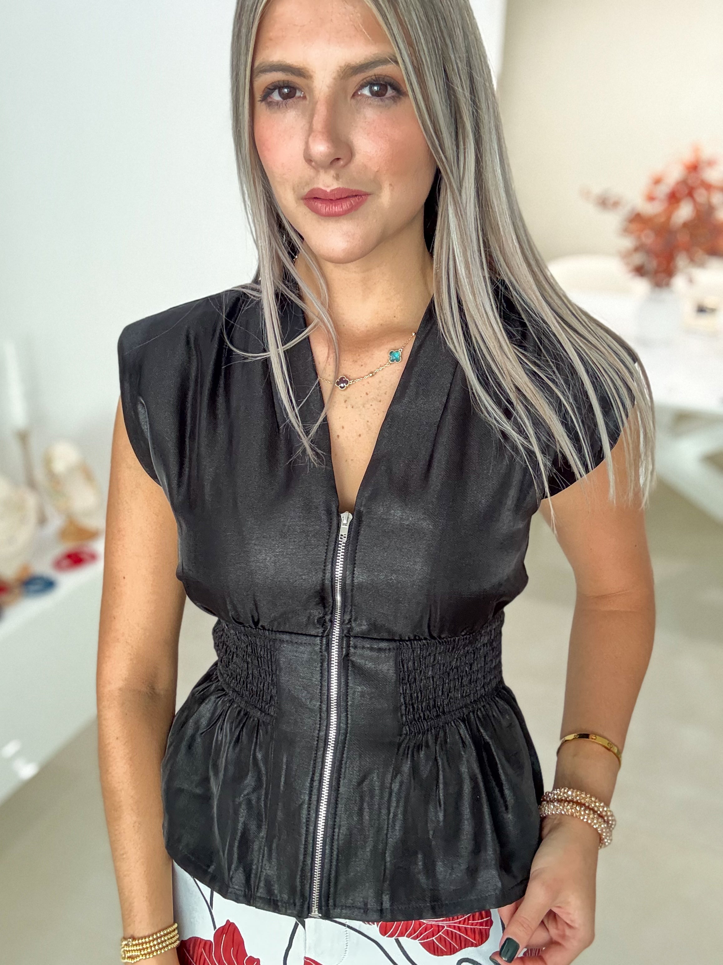 BLACK V-NECK SATIN ZIPPER BLOUSE