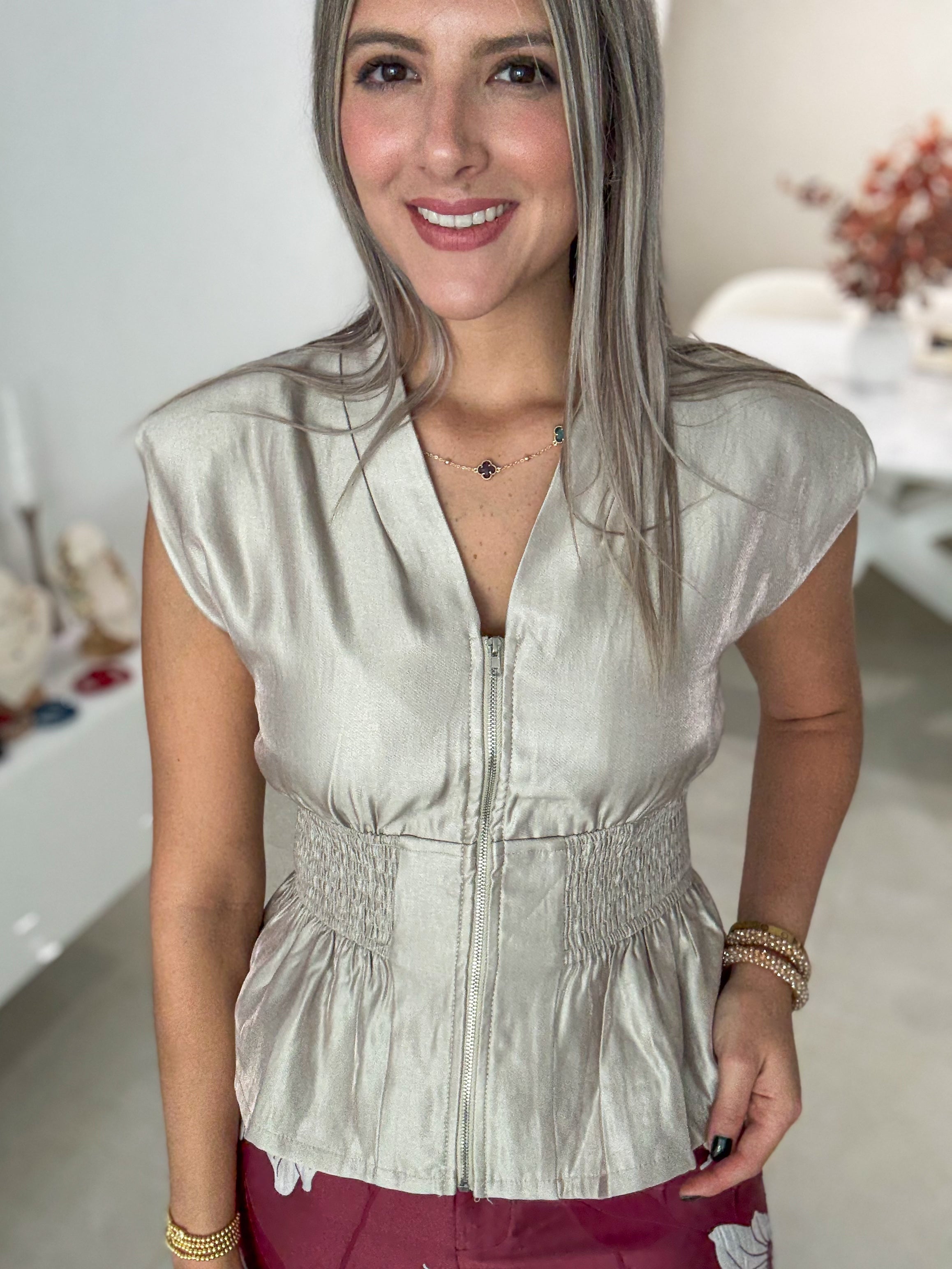 CHAMPAGNE V-NECK SATIN ZIPPER BLOUSE