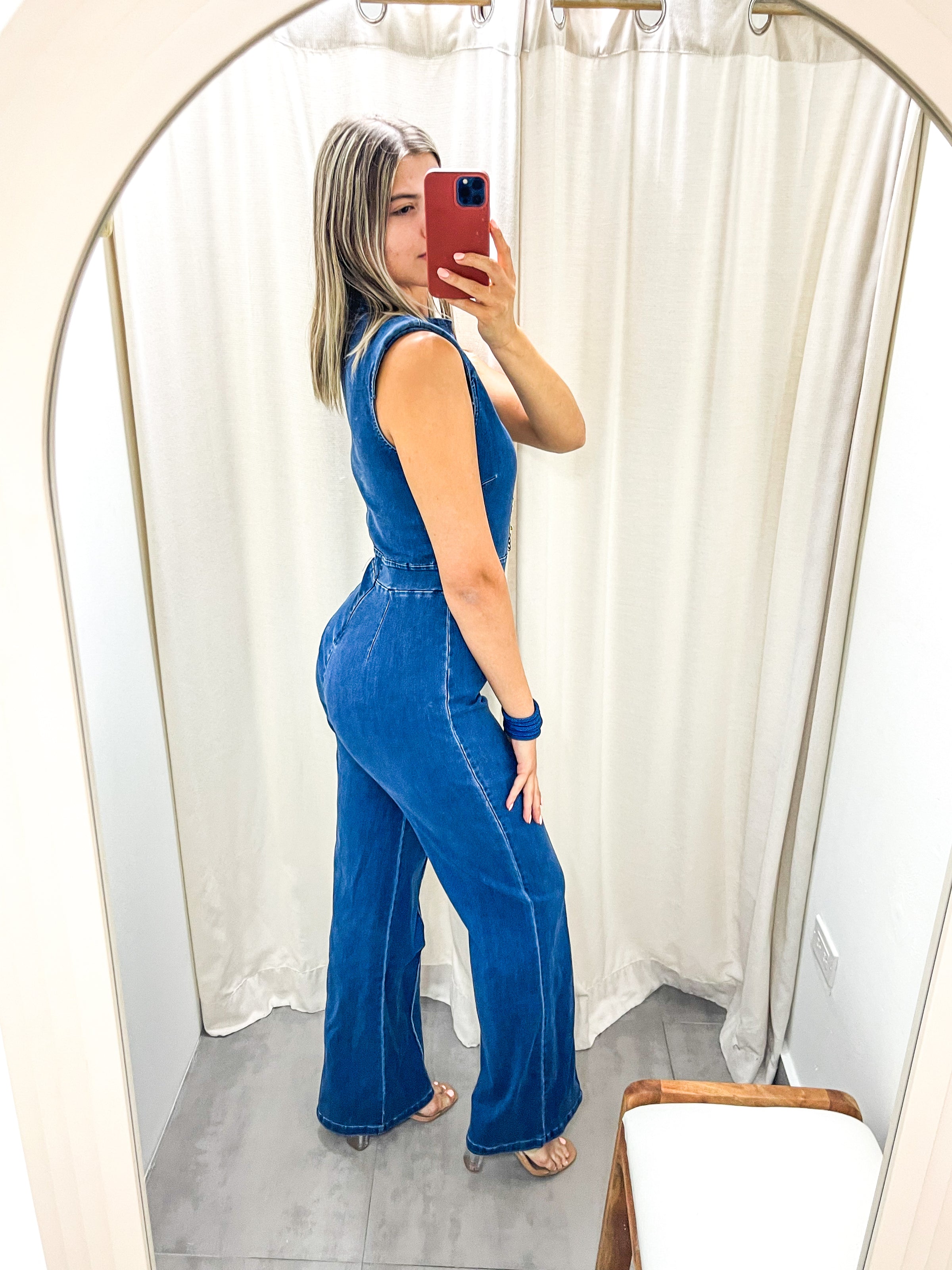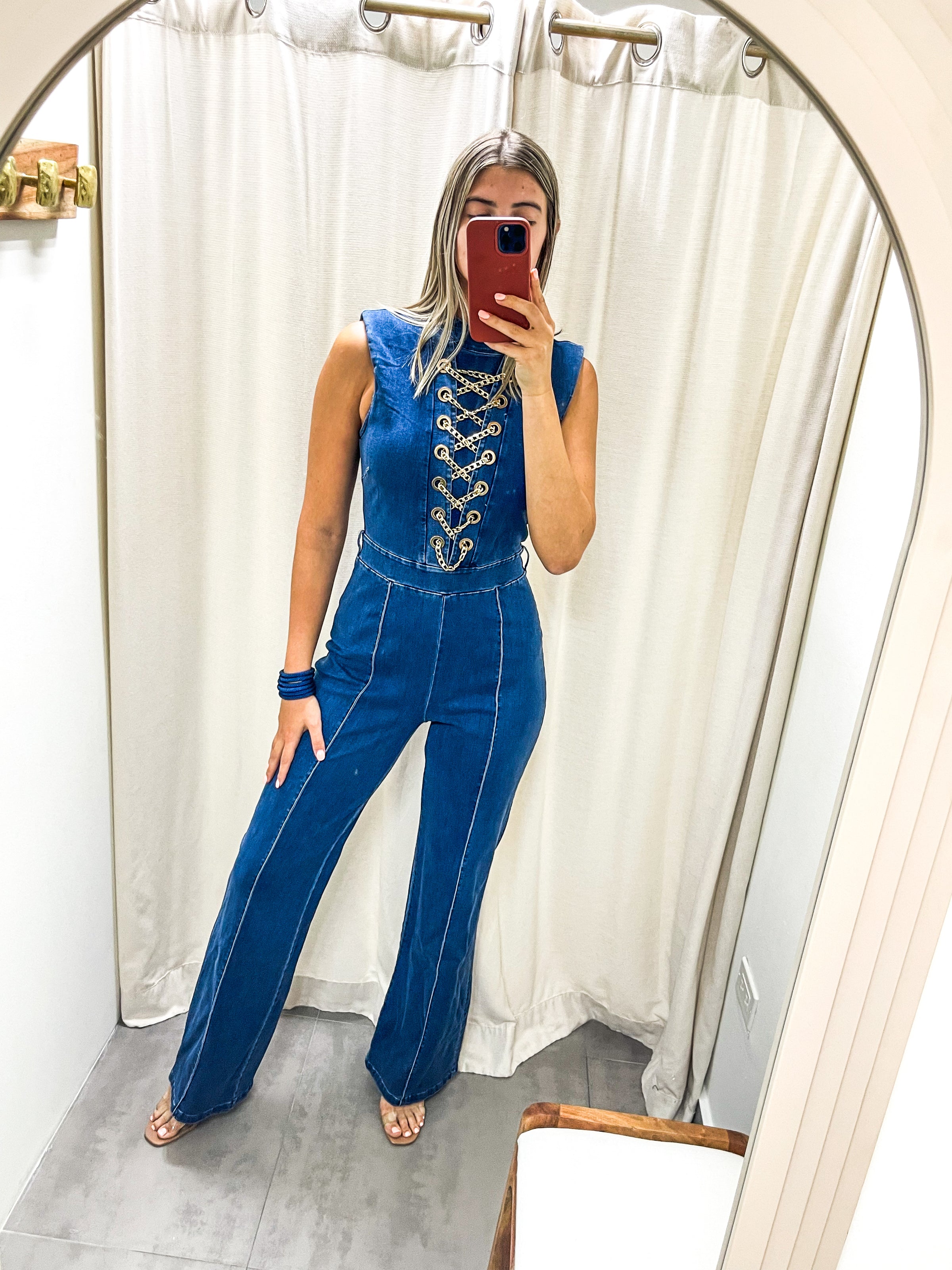DENIM BLUE CHAINS STRETCHY GLAM JUMPSUIT